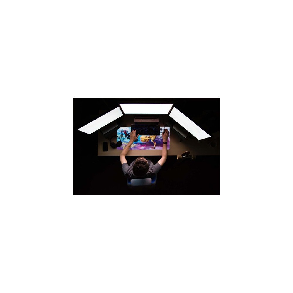 Protector de escritorio de superficie textil de alta densidad, óptima para un uso intensivo, preciso con cualquier tipo de ratón e impermeable. Bordes reforzados y base de goma antideslizante.