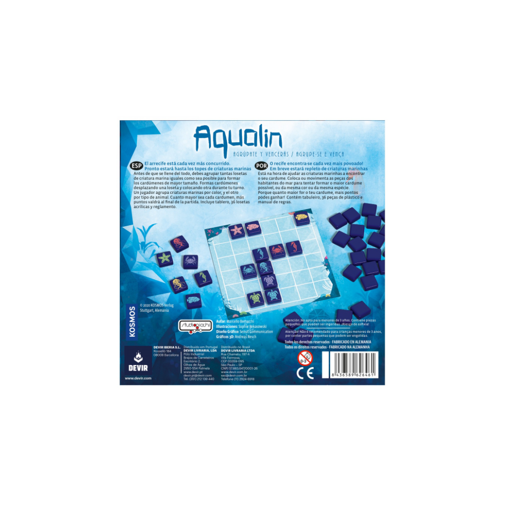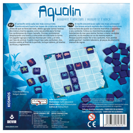 Diseñado por Marcello Bertocchi, Aqualin es un juego abstracto y estratégico de colocación de losetas para 2 jugadores, a partir de 8 años, que ofrece partidas de unos 20 minutos de duración. En un arrecife rebosante de vida marina, los jugadores compiten para sumar la máxima puntuación posible, formando o bien grupos de un color o bien bancos con el mismo tipo de animal. En turnos sucesivos, los jugadores añadirán y moverán las fichas para tratar de formar los conjuntos más favorables a sus intereses hasta que ya no quede espacio. Con los componentes justos, Aqualin ofrece un gran juego y una magnífica experiencia para todo tipo de jugadores. El arrecife donde se desarrolla la acción es un tablero central con 36 casillas, dispuestas en 6 columnas y 6 filas. A su alrededor se disponen las 36 fichas de vida marina, en las que encontramos estrellas de mar, cangrejos, tortugas, medusas, caballitos de mar y peces, todos ellos en distintos colores. ¡No hay dos fichas iguales bajo el agua! Antes de empezar la partida, se forma un mercado central revelando 6 fichas, que estarán a disposición de ambos jugadores. Una vez decidido quien puntuará por el color y quien por el tipo de animal, empieza la partida. En su turno, un jugador puede mover una ficha del arrecife a lo largo de una columna o fila hasta que encuentre un obstáculo (es decir, otra ficha o el borde del tablero) y debe añadir una ficha nueva desde el mercado central. Finalmente, toma al azar una de las fichas restantes para que esté disponible en los próximos turnos. En Aqualin las corrientes de agua son caprichosas… ¡La vida marina forma nuevos bancos constantemente! Sin embargo, a medida que el arrecife se va llenando cada vez queda menos espacio para nadar. Una vez que las 36 casillas están ocupadas, se hace el recuento de puntos de victoria. Los bancos se forman con grupos de dos o más criaturas marinas adyacentes, del mismo tipo o color, ¡Pero las fichas en diagonal no cuentan! Cuanto más grande sea el banco, más puntos reportará. Los amantes de los puzles no pueden dejar pasar Aqualin, un título que promete duelos muy intensos en los que un solo movimiento puede decidir toda la partida. Sus reglas sencillas lo hacen ideal también para los más pequeños o para aficionados esporádicos a los juegos de mesa. Sumergíos en el arrecife y descubrid la riqueza de la diversidad de la vida marina, mientras ponéis a prueba vuestra capacidad para controlar sus movimientos y formar mayorías.