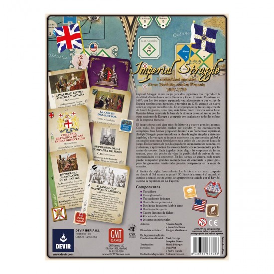 Lidera uno de los imperios más prósperos del final de la Edad Moderna y consigue la hegemonía mundial con la fuerza de tus tropas y el poder de tu ingenio. Obra de Jason Matthews y Ananda Gupta, autores del prestigioso Twilight Struggle, Imperial Struggle ofrece partidas para dos jugadores de unas 3 horas de duración. Este título recrea la rivalidad entre Francia y Gran Bretaña a lo largo del siglo XVIII por todo el mundo. Desde la India hasta Canadá, pasando por las islas del Caribe, los ejércitos y las flotas de estos dos imperios se disputan el liderazgo de su tiempo.