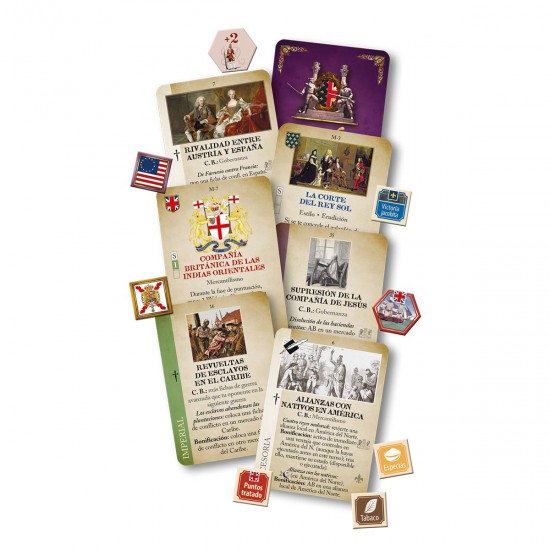 Además del paso de los turnos, el flujo de tiempo también se representa con tres mazos de cartas, que muestran personajes y hechos históricos relevantes del siglo XVIII. Ya sea a través de eventos o de los puntos de acción de las cartas, los jugadores podrán llevar a cabo acciones diplomáticas, militares o económicas para tratar de decantar la partida a su favor.