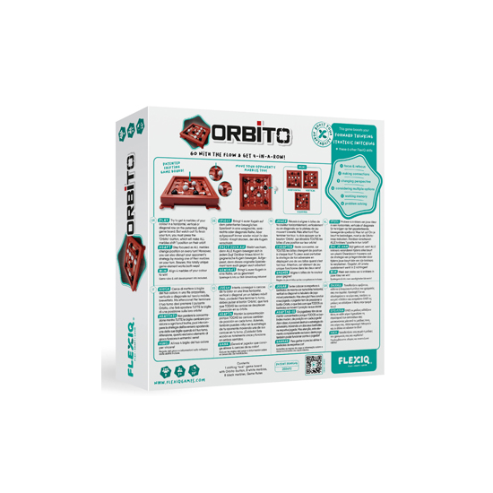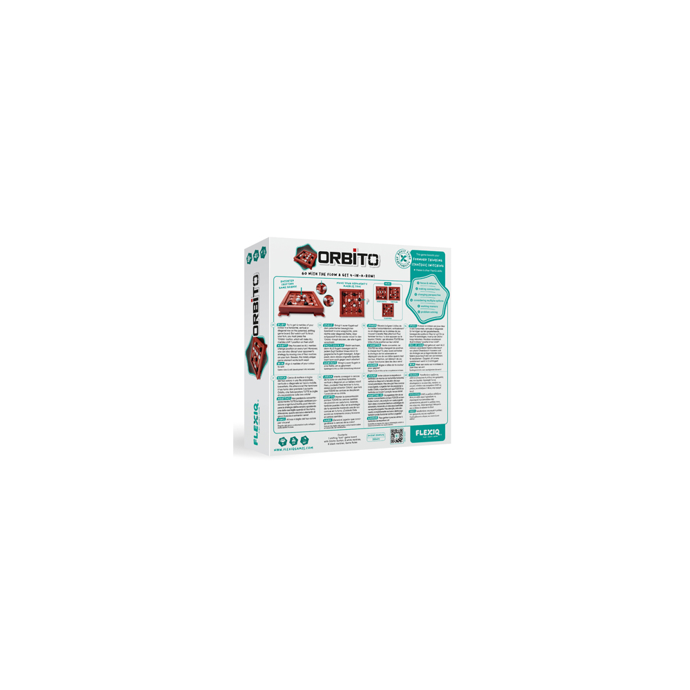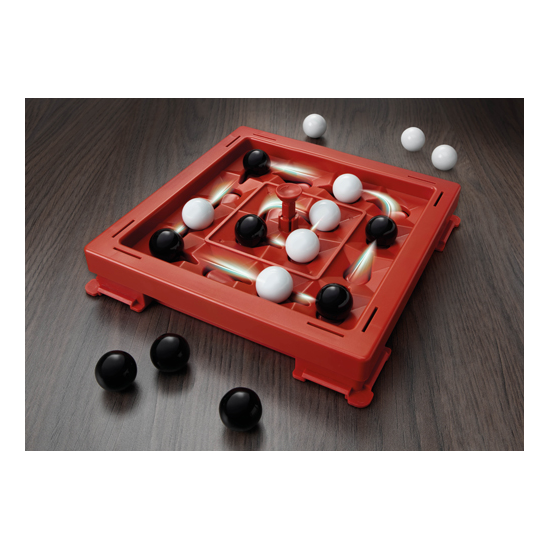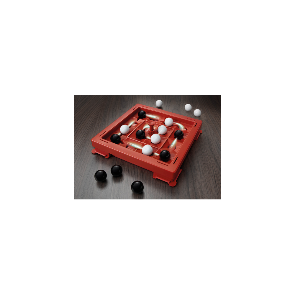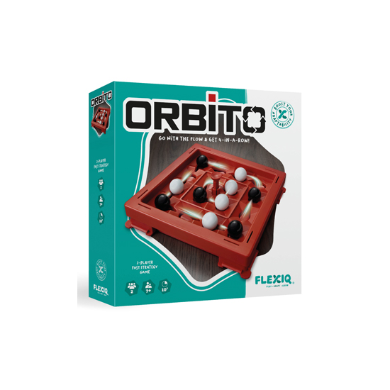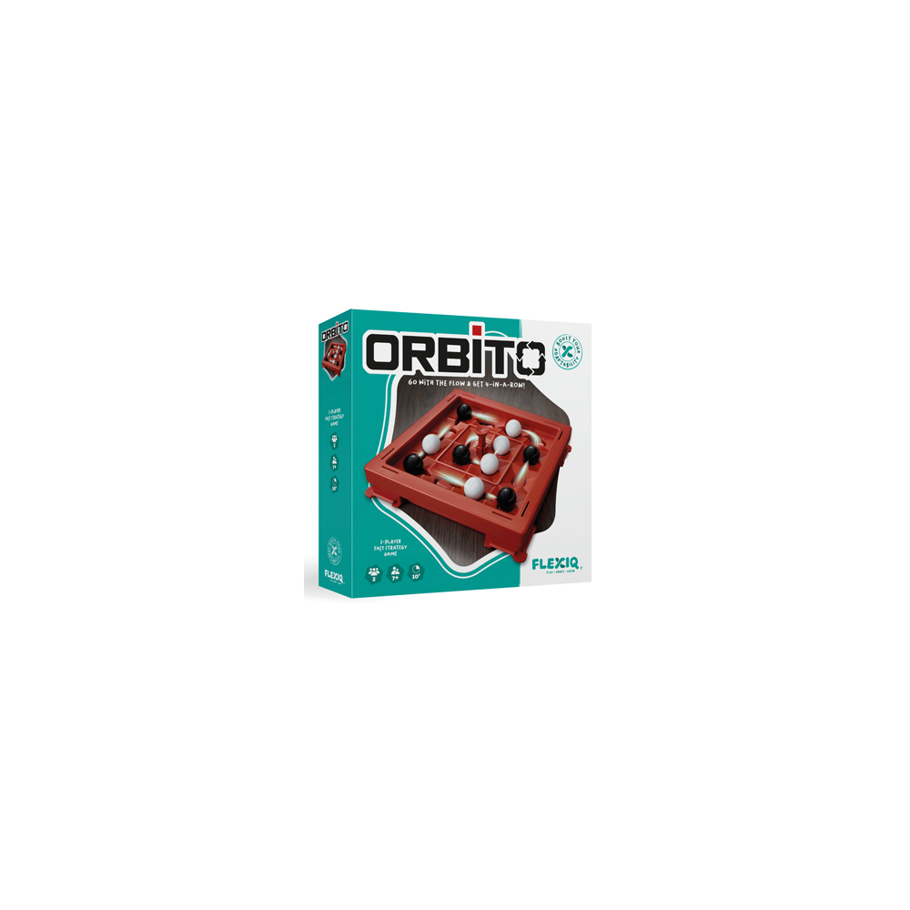 Juego de estrategia y pensamiento avanzado en el que el objetivo es lograr un 4 raya primero. Por turnos los jugadores/as añaden 1 canica al tablero y pulsan el botón Orbito que hace mover las canicas una posición. Antes de colocar la canica se puede mover una de las canicas del oponente a un espacio libre en cruz.