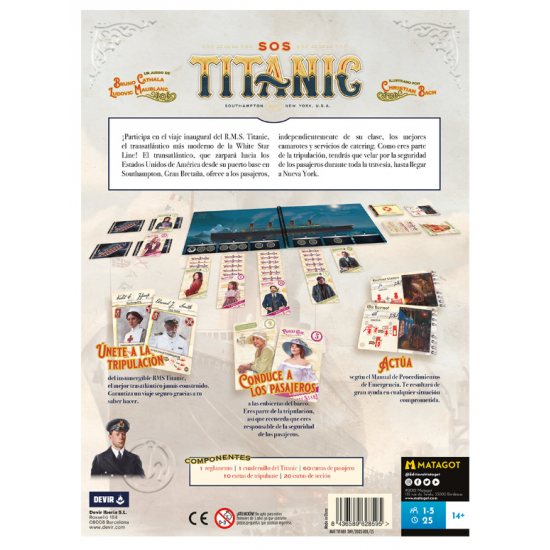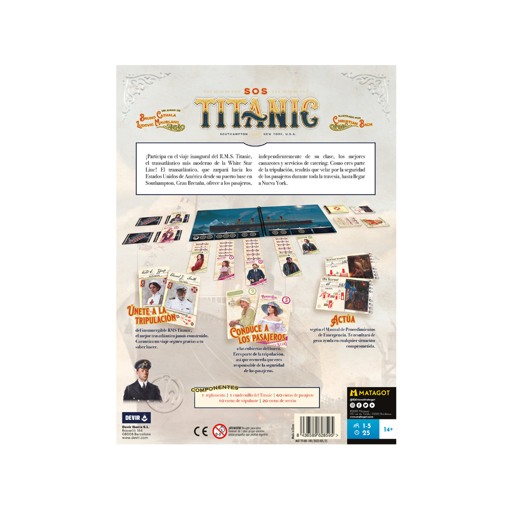 SOS Titanic es un juego de cartas cooperativo de 1 a 5 jugadores, a partir de 14 años. El título nos propone recrear el fatídico viaje inaugural del Titanic, ocurrido hace 111 años, en abril de 1912, y tomar el papel de miembros de la tripulación. Solos o en equipo, los jugadores ganarán puntos salvando tantos pasajeros como sea posible.