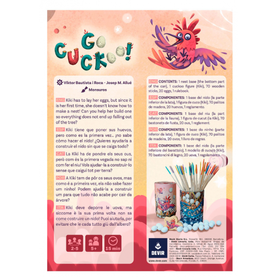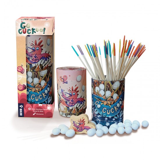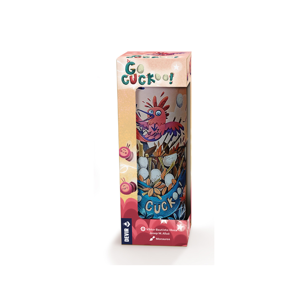 Todos los nidos están ocupados y el cuco Kuki no sabe dónde dejar sus huevos… ¿Podéis ayudarla a crear un hogar seguro para sus polluelos? En Go Cuckoo! deberéis construir un nido a partir de palitos y evitar que se caigan los preciados huevos. Diseñado por Josep María Allué y Viktor Bautista, este juego ganó el prestigioso premio As d’Or al mejor juego infantil en 2017. Las ilustraciones las firma Gabriela Silveira, responsable del arte de otros juegos como Fantasma Blitz. Una partida a Go Cuckoo! puede durar unos 15 minutos en partidas en las que pueden participar de 2 a 5 personas.