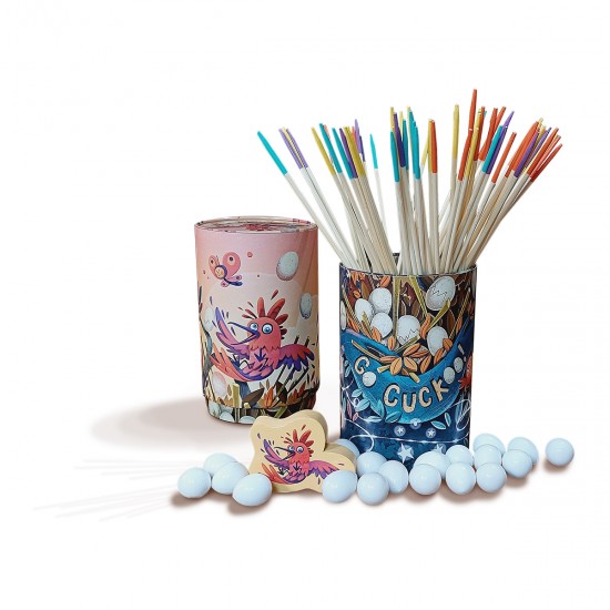 Preparad bien el pulso, ¡porque es vital en este juego de habilidad! En Go Cuckoo! los jugadores intentan construir un nido sobre una lata con bastoncillos de madera, similares a los del popular Mikado, que representan las ramas del nido. En cada turno, los jugadores deberán extraer los palitos y cruzarlos con cuidado para sustentar los huevos. Hay que hacerlo con cuidado de no tirar otros palos o los huevos colocados anteriormente. Ganará el primer jugador que, tras quedarse sin huevos, logre colocar la cuco Kiko en su nuevo nido.