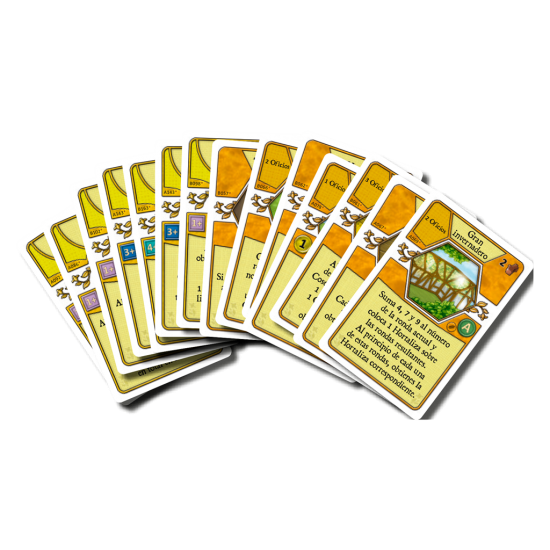 1 tablero principal, 4 tableros de Granja, 1 tablero de Adquisiciones mayores, 2 ampliaciones, 2 piezas de variante, 1 pieza de Quehaceres, 23 losetas de Campo/Habitación de madera, 16 losetas de Habitación de adobe/piedra, 36 fichas de 1 Alimento, 8 fichas de 5 Alimentos, 3 fichas de Sugerencia, 10 fichas de Recurso, 120 cartas (Adquisiciones, Oficios y Rondas), 1 bloc de puntuación, 1 reglamento y un apéndice. Figuras de madera: 18 Ovejas, 15 Jabalíes, 13 Vacas, 30 Maderas, 24 Adobes, 14 Juncos, 16 Piedras, 24 Cereales, 18 Hortalizas, 1 peón de Jugador inicial, 60 Cercas, 16 Establos y 20 Granjeros.