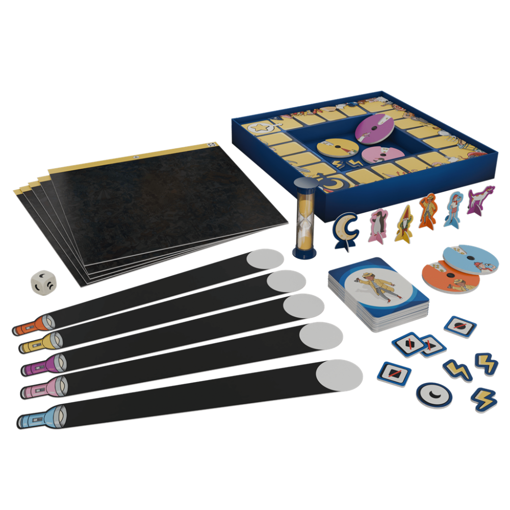5 tableros, 1 reloj de arena, 5 diales (en 5 colores), 5 linternas mágicas (en 5 colores, doble cara), 60 cartas de búsqueda, 5 peones, 1 dado lunar, 7 fichas de prisa, 1 peón lunar, 4 fichas de cuadrante, 5 cartas de cuadrante, 1 ficha de reto y 1 póster.