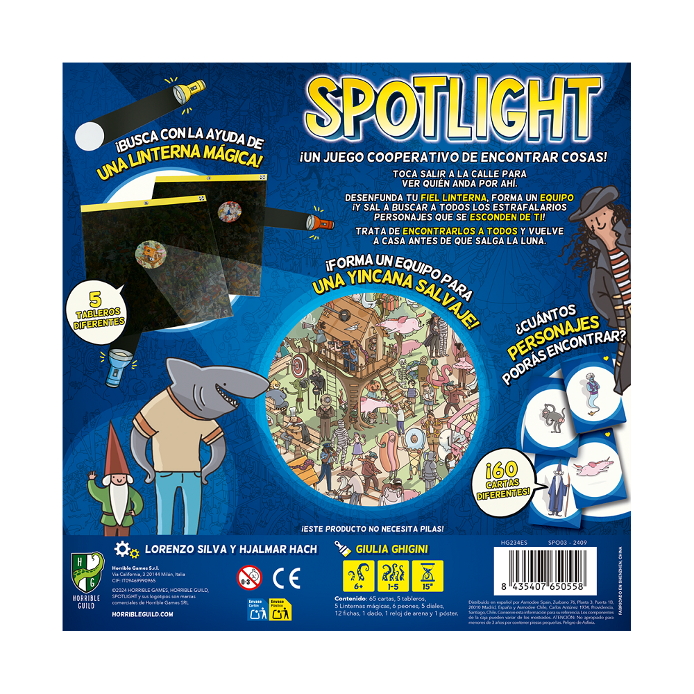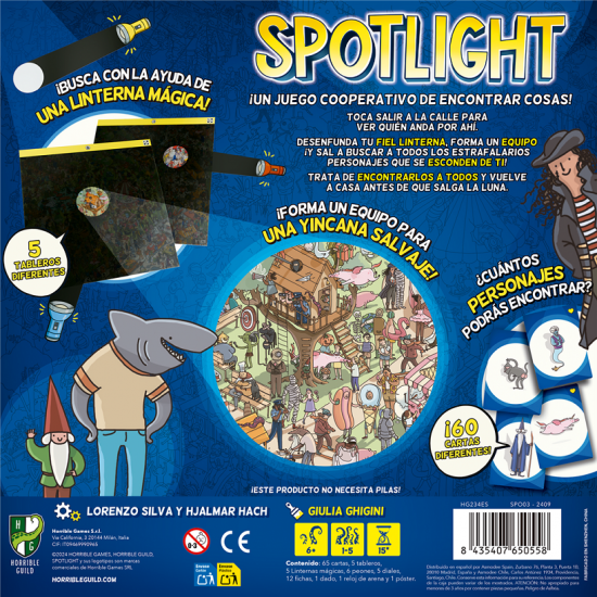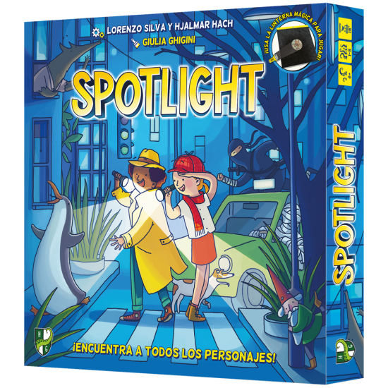 Spotlight es un juego cooperativo en el que todo el mundo colabora para descubrir tantos personajes ocultos como sea posible. Jugad 5 rondas, ayudaos mutuamente ¡y aseguraos de que nadie llega a casa demasiado tarde!