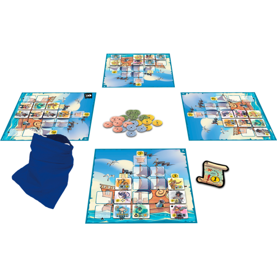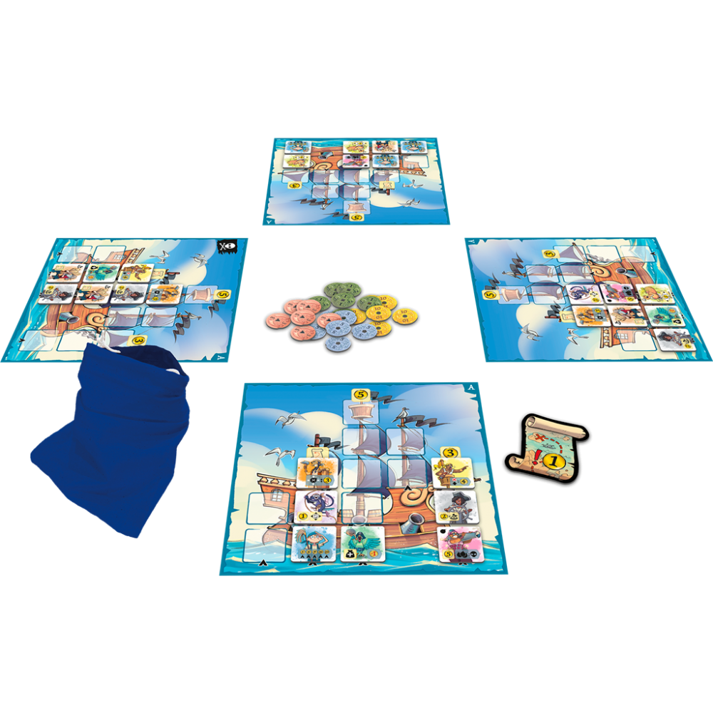 10 tableros de Aventura (de doble cara), 72 fichas de Pirata (de doble cara), 40 Monedas (con valor de 1, 3, 5 y 10), 1 Mapa del tesoro, 1 Bolsa de tela, 3 Ayudas de juego, 1 reglamento