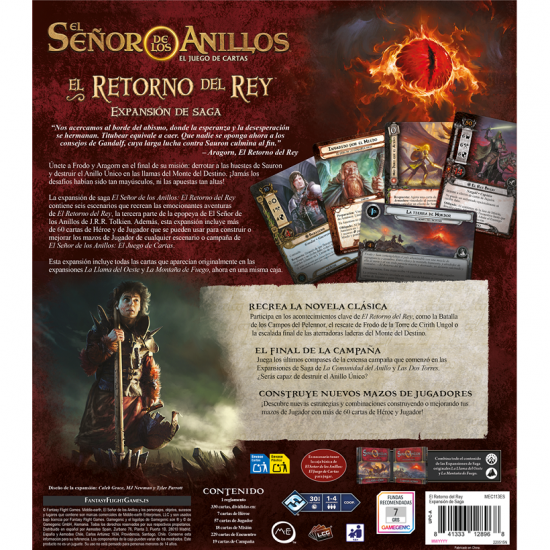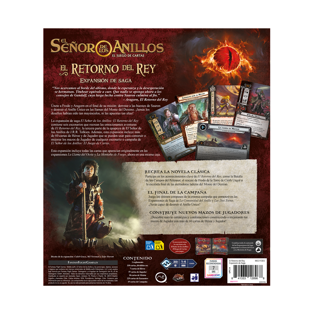 La expansión de saga El Señor de los Anillos: El Retorno del Rey contiene seis escenarios que recrean las emocionantes aventuras de El Retorno del Rey, la tercera parte de la epopeya de El Señor de los Anillos de J.R.R. Tolkien. Además, esta expansión incluye más de 60 cartas de Héroe y de Jugador que se pueden usar para construir o mejorar los mazos de Jugador de cualquier escenario o campaña de El Señor de los Anillos: El Juego de Cartas.