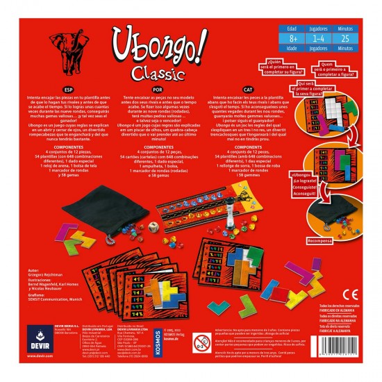 En Ubongo, todos los jugadores eligen una plantilla nueva de la pila de plantillas, tiran el dado e intentan terminar sus figuras antes de que se acabe el tiempo. Este juego se termina después de 9 rondas, momento en el que los jugadores proceden al recuento final de sus gemas, calculando los puntos finales. Ubongo incluye 36 plantillas con 432 combinaciones distintas, ofreciendo horas de jugabilidad. Si nadie logra completar su plantilla en el tiempo límite, no pasa nada y los jugadores tienen una segunda oportunidad dando la vuelta al reloj de arena otra vez. Este juego es perfecto para jugar con toda la familia o puedes practicar en solitario para afinar tus habilidades. Se enseña muy rápidamente, pero tendrás que ser ingenioso para poder colocar todas las fichas encima de tu tablero antes que tus compañeros. La presión de acabar antes que el reloj, y la calma cuando ya por fin has logrado rellenarlo todo, hace que este juego sea fantásticamente adictivo y apto para todo tipo de jugadores.