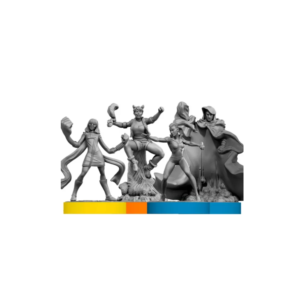 Incluye tres miniaturas con sus respectivos diales de vida y fichas de ayudante.