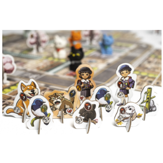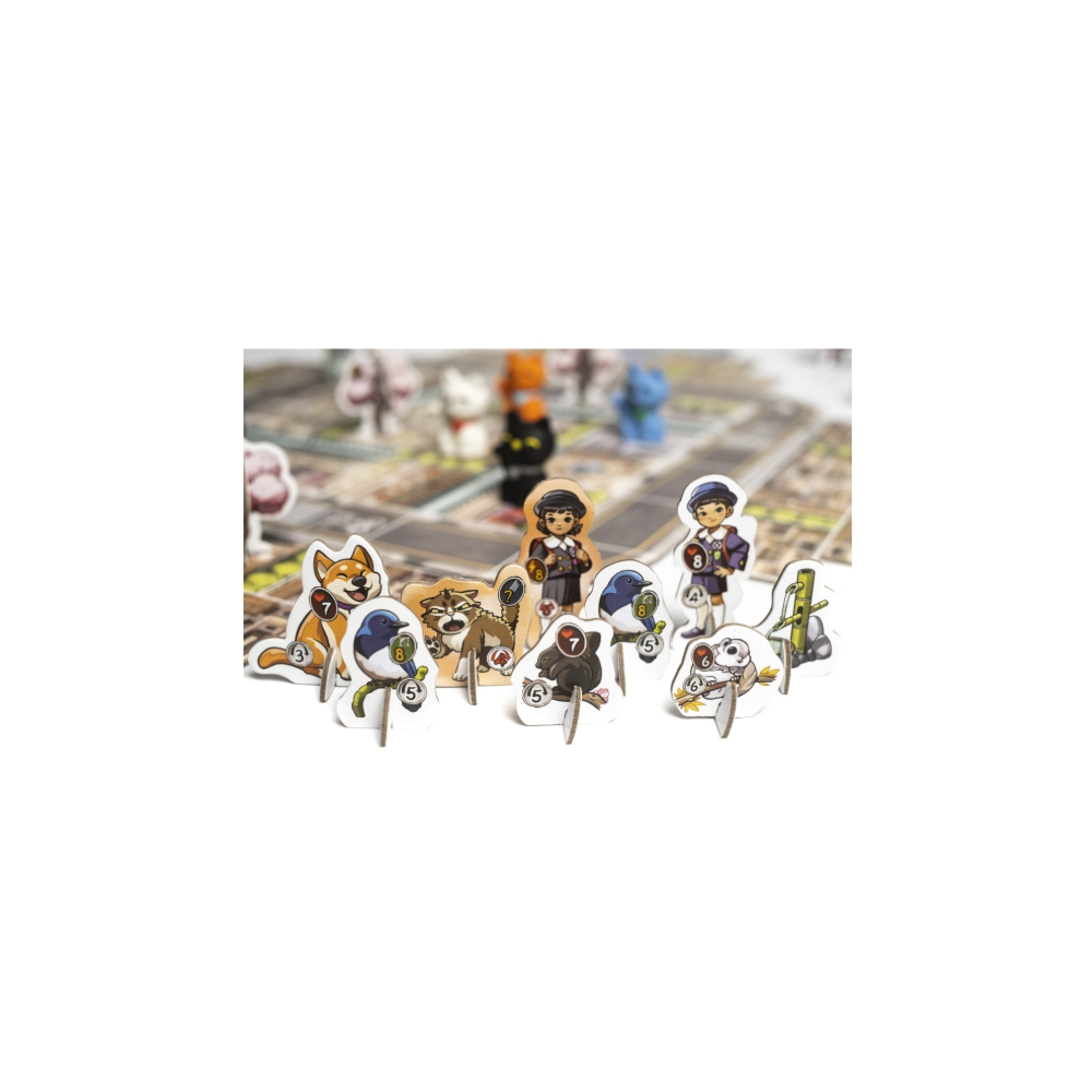 Mediante un sistema de habilidades, Kyoto no Neko hará que cada participante interactúe con algunos de los habitantes de Kyoto, tanto animales como humanos. Cada turno ofrece la oportunidad de descubrir algo nuevo sobre la ciudad, ya que los participantes revelarán elementos que van desde pequeños insectos hasta objetos o habitantes específicos de Kyoto. Mientras que algunos de estos elementos están representados por fichas de cartón, otros vienen como personajes de pie, lo que garantiza una presencia visual impresionante.