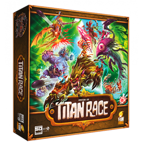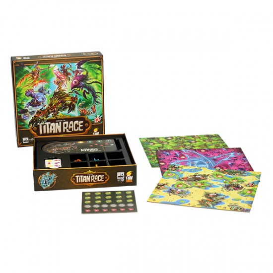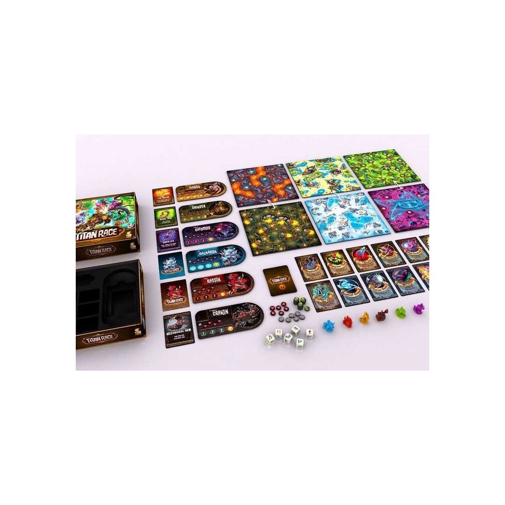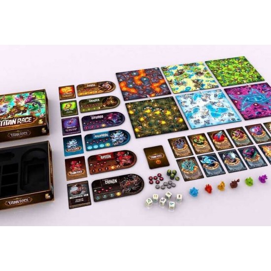 En el juego de mesa Titan Race enfrenta a tus Titanes, unos contra otros en una carrera completamente alocada y salvaje! Juega como un jinete y su montura titánica usando tu poder, astucia, y toda clase de objetos mágicos para intentar ganar la carrera. Embiste a tus oponentes para debilitarlos, sé el primero en cruzar la línea de meta y conviértete en la próxima leyenda de Neverworld!