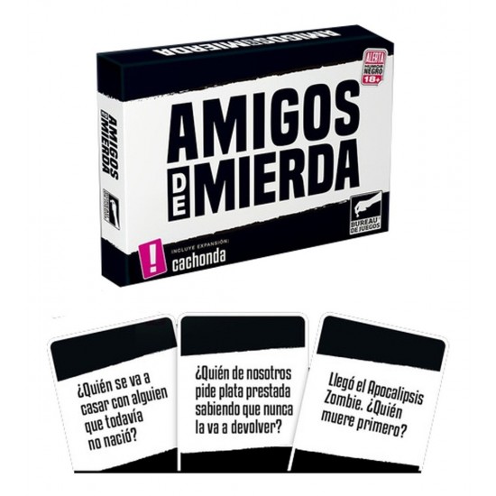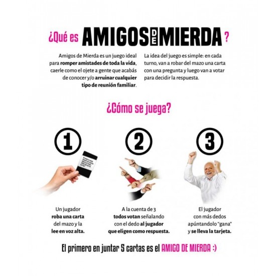 ERES UN FALSO ¡Pero te vamos a ayudar! En Amigos de Mierda vas a poder decirle a tus amigos lo que siempre pensaste de ellos y nunca te atreviste a decirles. En cada turno, se saca una carta y se lee en voz alta. Todos votan la respuesta entre los que están jugando. El que tenga más votos gana la carta y el primero en ganar cinco cartas es coronado como un «Amigo de mierda».