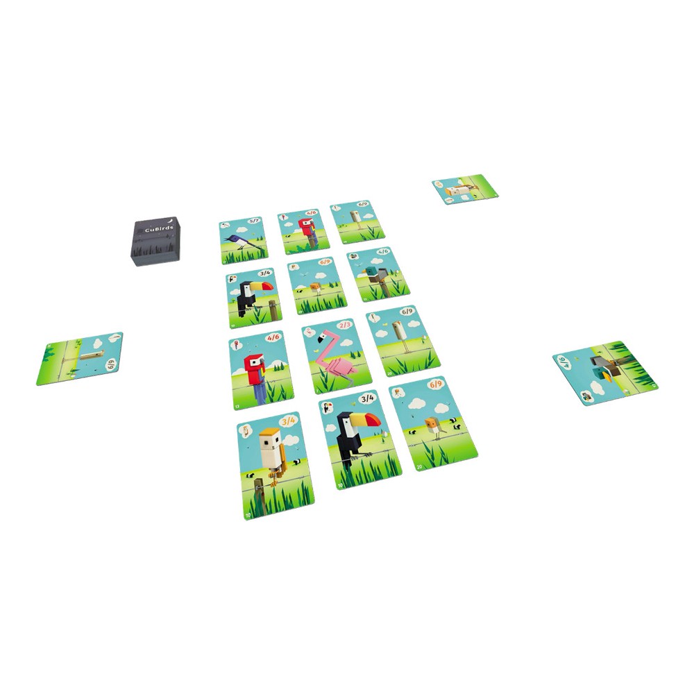 Los jugadores comienzan cada ronda de Cubirds con ocho cartas de pájaro. Sobre la mesa habrá también cuatro filas de pájaros (vallas). En tu turno, colocarás una serie de pájaros iguales en el extremo de una de las vallas. Los pájaros del mismo tipo se unirán, haciendo que los que hayan sido rodeados vuelen hacia tu mano. Cuando tengas un número suficiente de pájaros iguales en tu mano, podrás bajarlos a tu zona de juego.