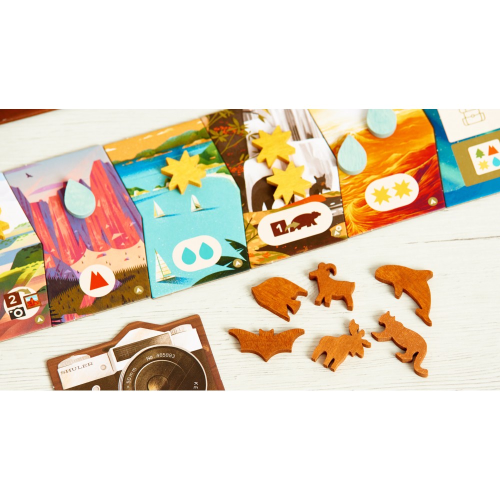 Todo esto, disfrutando de la belleza de cada uno de los parques nacionales de Estados Unidos y usando cartas de gran tamaño y cartas pequeñas, losetas, meeples de excursionistas, fichas personalizadas de recursos (las fichas de animales son todas diferentes), una chapa metálica de inicio, una gran ficha de cámara de fotos y fotos pequeñas (todas diferentes).