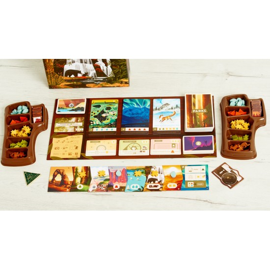 Parks es un juego de mesa en el que os pondréis en la piel de dos excursionistas y recorreréis las rutas de los parques nacionales más bellos de los Estados Unidos. Cada viaje será una experiencia única gracias al equipo que llevéis y a las fotografías que toméis por el camino. ¡Disfrutad de un viaje inolvidable con Parks!