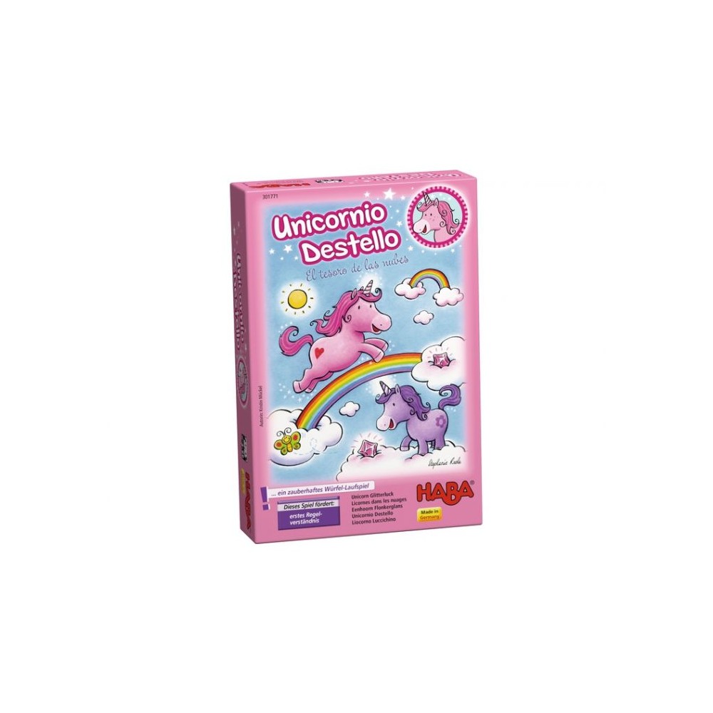 Unicornio Destello: El tesoro de las nubes es un juego infantil, de 2 a 4 participantes, en el que tendréis que ayudar a los unicornios a llegar lo más rápido posible hasta el sol.