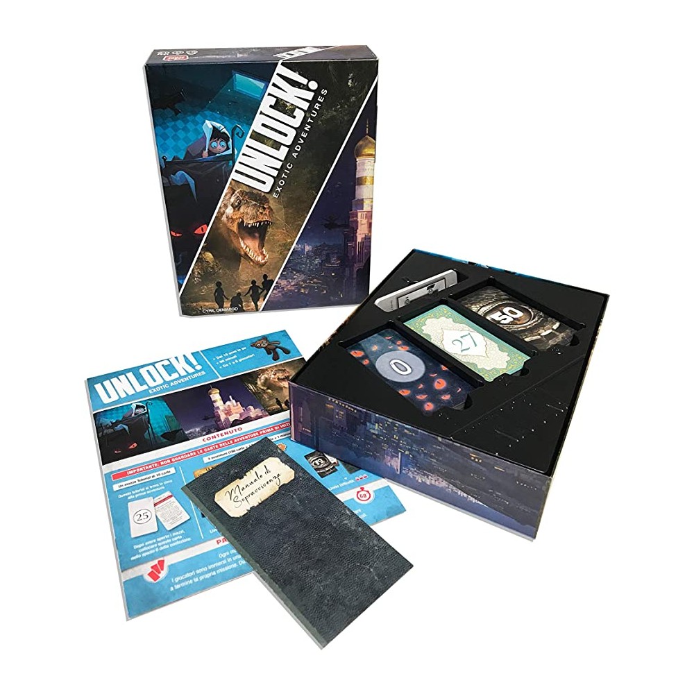 Unlock: Exotic adventures es un juego de cartas cooperativo inspirado en las salas de Scape Room. Unlock: Exotic adventures cuenta con tres aventuras diferentes, con distintas ambientaciones que deberás de resolver a tiempo para ganar.