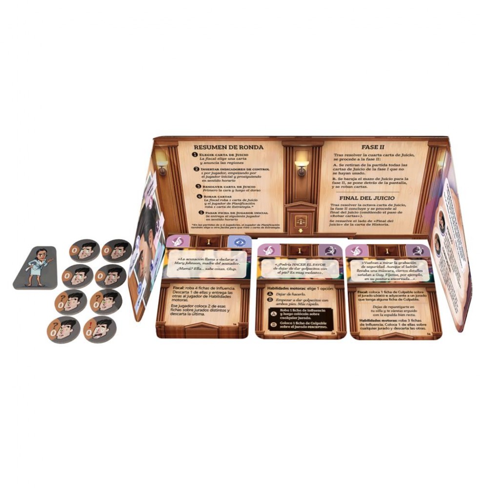 1 tablero de juego • 5 plataformas de plástico • 1 reglamento • 48 cartas de Juicio • 24 cartas de Estrategia • 13 cartas de Rol • 4 cartas de Historia • 100 fichas • 1 plataforma de mente • 5 hojas de referencia • 1 pantalla de fiscal